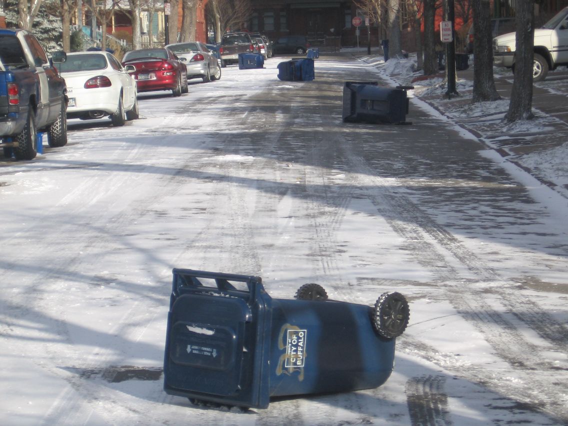The other day the wind blew in like nothing I’ve seen in years. Gust were in the upwards of 60mph. Schools and businesses were closed; many were without electricity; windows on some homes and businesses blew in. This photo doesn’t really do it justice, but here’s a picture of my street. It was garbage day.