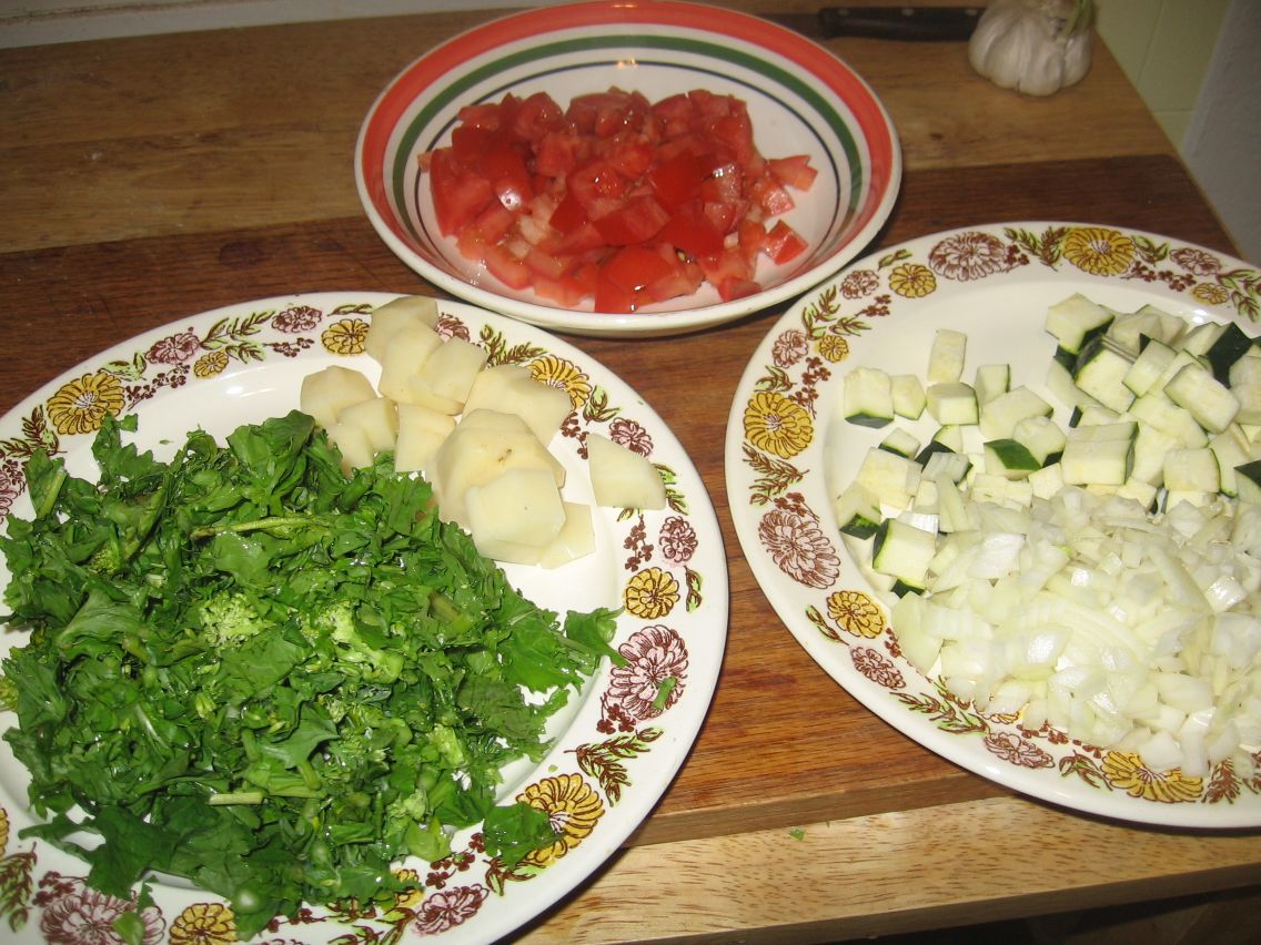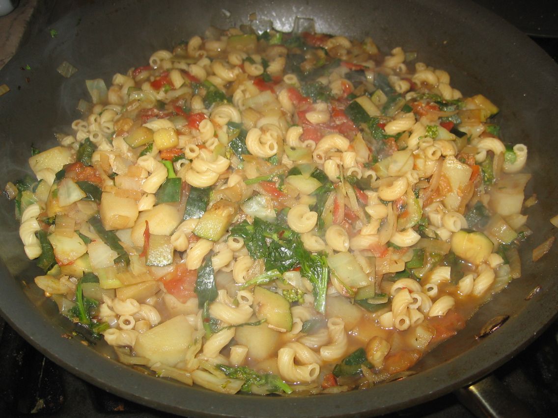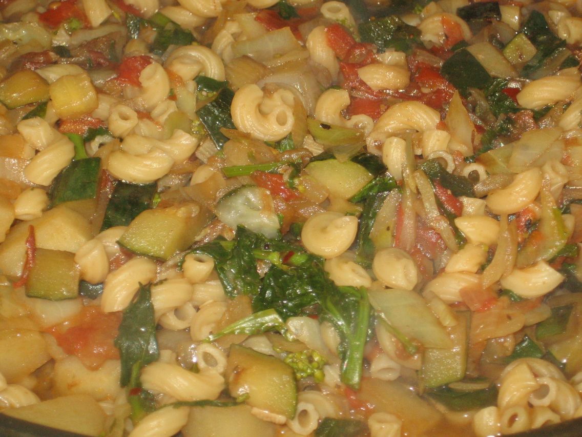 At any rate, I came home from my swim famished. I did what I often do, and that is rummage around in my refrigerator, see what I have, chop it up, saute it in olive oil, garlic, and hot peppers, and toss it with pasta.