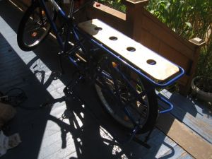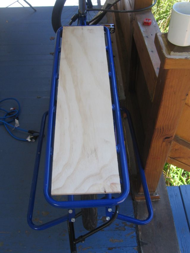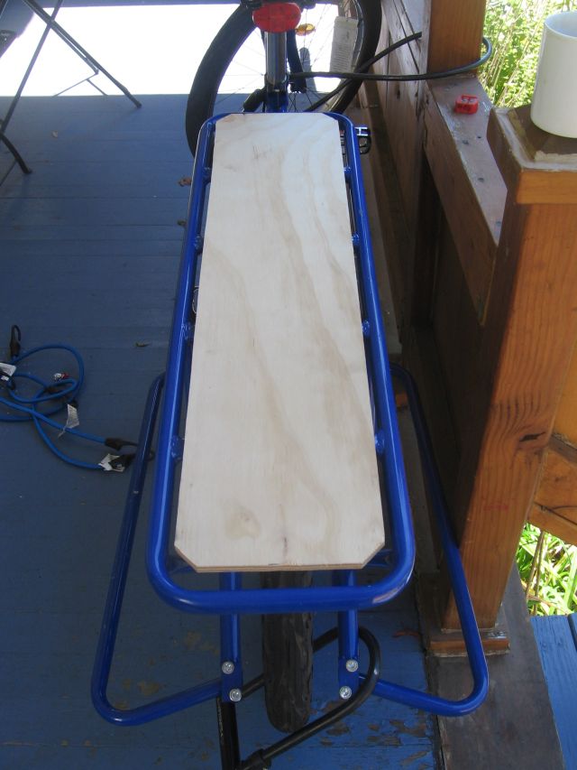 Anyhow, I hauled home the piece of wood and measured and penciled a section 7 by 30 inches. I cu t it to this size (which is slightly smaller than the rear rack) so that I would still have access to the frame for bungees.