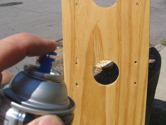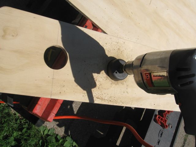 I then cut out 1 1/2 inch sections with a drill with a boring attachment (it’s the same attachment you use when installing a doorknob…it’s simple to do and the tool is inexpensive).