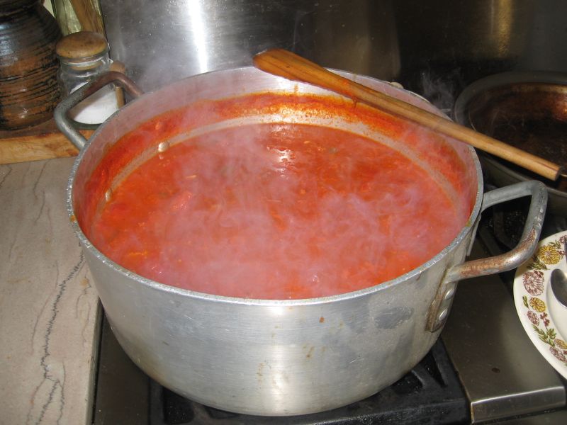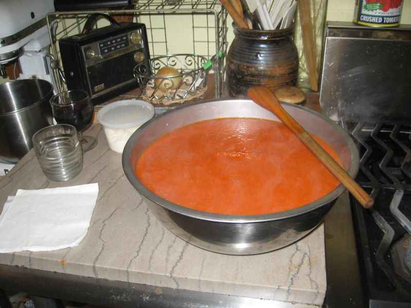 Tomatoes are my favorite garden vegetable to grow. They’re my favorite for a couple of reasons: firstly because I enjoy eating them raw or in almost any preparation, and secondly, after the initial planting they are almost worry free…give them sun and water and you’re guaranteed a good crop by August. At any rate, I always seem to plant too many and get a little overwhelmed when they all start to ripen at once…faster than I can consume them. So for the past 5 years or so I’ve started making a large batch of basic tomato sauce and freezing it, and it usually lasts most of the winter. The flavor is incredible. I usually season it lightly with onion, a couple peppers, garlic, salt, fennel, basil, and a little sugar. This way if I want to use it in another application (such as an Indian dish, or Cajun, or Lebanese) the flavors are mild enough that I can adapt it.