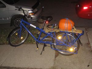 >Two more items I’ve recently carried (with ease) on my Mundo Yuba. One was a 15 gallon stock pot. I had a catering event to work and the pots were not big enough so I decided to bring my own…on my bicycle. The other was a twenty pound pumpkin. The only problem was that I thought the bungee cords would slip and the pumpkin would fall…but they didn’t. Of course I could have used my vehicle to carry both these items, but this is way more fun. After I build and install sideboards the loading capacity will be increased. The looks I get from people are pretty interesting, and I can only imagine what they are thinking…seeing this middle-aged guy on a weird-looking bike carrying these odd items. This alone makes it worth the trip.