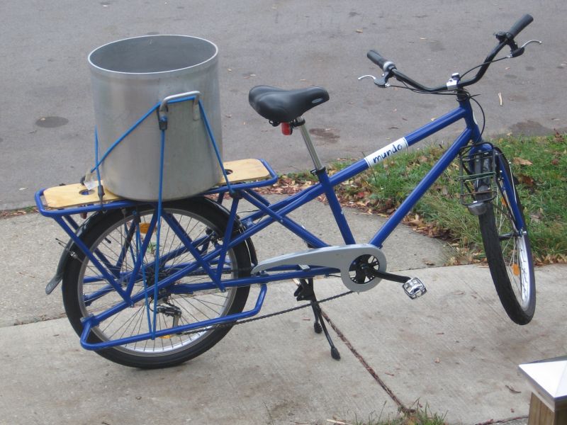 >Two more items I’ve recently carried (with ease) on my Mundo Yuba. One was a 15 gallon stock pot. I had a catering event to work and the pots were not big enough so I decided to bring my own…on my bicycle. The other was a twenty pound pumpkin. The only problem was that I thought the bungee cords would slip and the pumpkin would fall…but they didn’t. Of course I could have used my vehicle to carry both these items, but this is way more fun. After I build and install sideboards the loading capacity will be increased. The looks I get from people are pretty interesting, and I can only imagine what they are thinking…seeing this middle-aged guy on a weird-looking bike carrying these odd items. This alone makes it worth the trip.