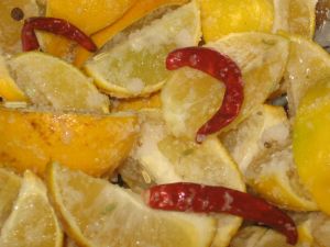I inherited a few meyer lemons from work the other day. I knew that I had more than I would use so I salted them and put them on a shelf to ferment next to my current batch of kim chi. Salted and preserved lemons are a classic ingredient to Morrocan cuisine; the French refer to them as citron confit, which sounds a little more romantic (but it still means the same thing). At any rate, they’re simple to make: salt them, add water and/orlemon juice and whatever seasonings you like, and allow them to ferment. Once fermented the diced or slivered rind adds an excellent flavor to soups, stews, or a traditional tagine.