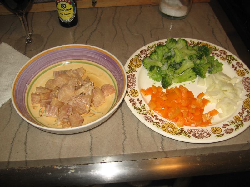 The fish I used was tilapia, because that’s what I had, but you can really use any firm seafood that will hold up to stir-frying (chicken, pork, or beef–or tofu, if you want to go vegetarian–would work well in this recipe also). Anyhow, I diced the fish, sprinkled it with a couple tablespoons soy sauce, then tossed it in a couple tablespoons cornstarch, and let it rest while I cooked the rice and had a glass of wine.