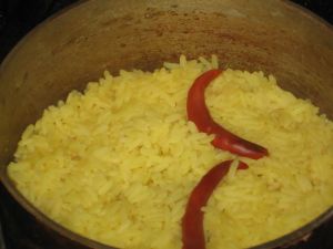 Cook some long grain rice in broth (I used chicken) with a little curry and a couple whole chilies. Use the ratio of two parts liquid to one part rice; cook it covered for 18 minutes covered, then shut it off and let it rest while you prepare the stir fry.
