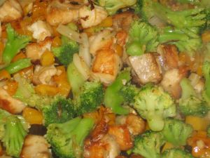 Remove the fish to a plate and set aside. Return the skillet or wok to the flame (you may need to add a little more oil). Add the vegetables, first the onions and peppers, then the garlic, then the broccoli, and stir fry for a few minutes until it starts to brown. Sprinkle the vegetables with a little soy sauce (this will flavor it, and also create enough steam to loosen anything stuck to the pan), then add the fish back to the pan and toss gently.