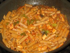 Simmer the sauce for 5 or 10 minutes, then toss it with a pasta of your choice. My favorite shaped pasta is penne rigate, or literally, ribbed pen; the ribs tend to hold the sauce better than smooth pasta. And my favorite brand pasta is Barilla, but more specifically their Barilla Plus line of pasta. These pastas (or more grammatically correct, I believe, pasti) are loaded with all kinds of good and healthy ingredients. To read an article about them click here.