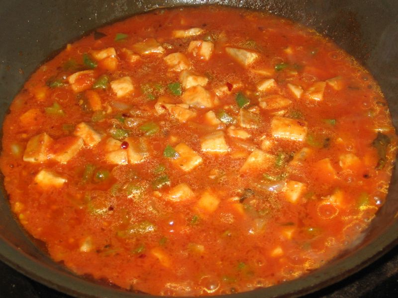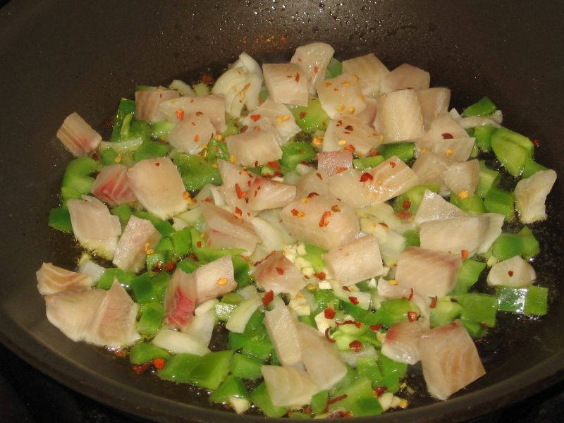 Dice the fish along with onions, peppers; mince a couple cloves garlic. Heat a pan with virgin olive oil, then saute the onions and peppers. Just when they begin to brown, add the fish, garlic, and a good pinch of crushed hot peppers (a couple anchovies would be good at this point, but I didn’t have any at the time). Cook the fish until it too begins to brown, taking care not to burn the garlic or break the fish into small pieces.