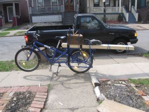 When I was loading the boards onto my bike at the Home Depot (about 3 miles from my house) I got a few odd looks. But then as I was pedaling (almost) effortlessly through the parking lot I saw a guy attempting to put the same length boards in the trunk of his car; he had to tie the trunk down with the boards hanging out. He may have gotten home sooner; he may have used less effort on the way home, but I can say without doubt that my ride home was more fun.