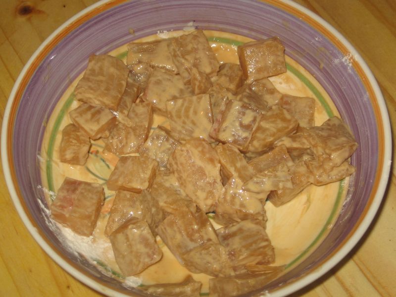 I started by dicing the fish and marinating it in a little soy sauce and cornstarch.