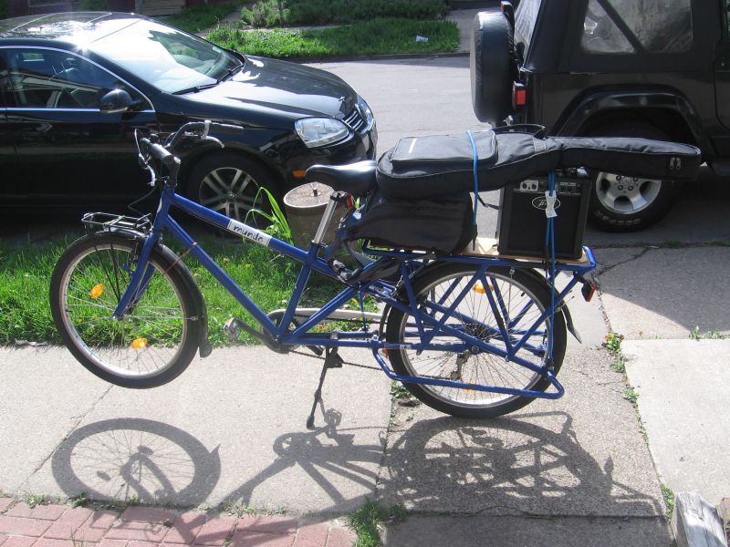 >Things That Can Be Carried On A Bike (#18) Posted byJoeMay 15, 2009February 10, 2011Posted inBicycling, Car Free, Cargo Bike, Mundo Yuba, Simplicity, urban simplicity, Utility Bike, Yuba >A backpack containing about 40 pounds of books.An electric guitar.A small practice amp. Share this: Click to share on Facebook (Opens in new window) Facebook Click to share on X (Opens in new window) X Like Loading... Related