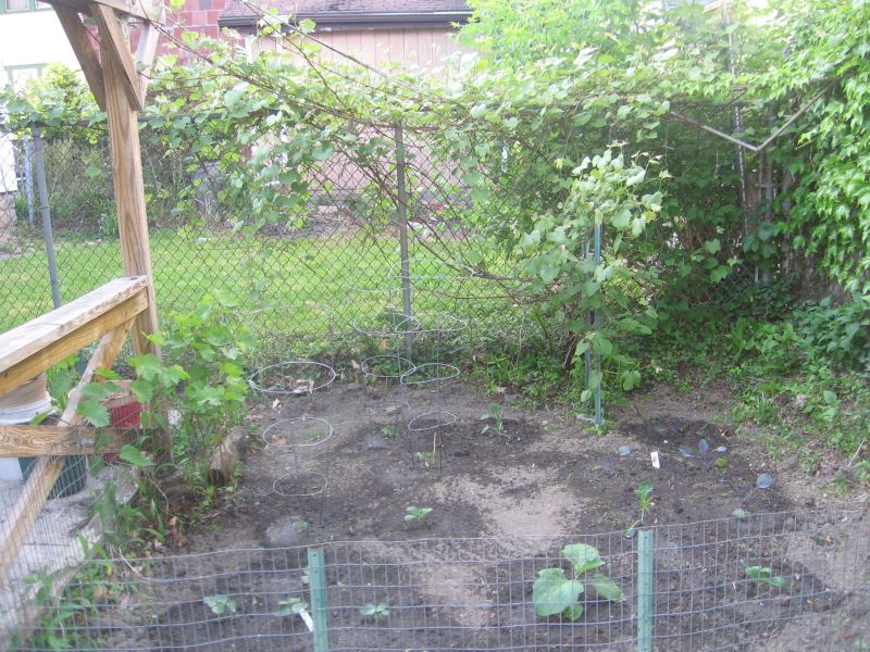 The back yard garden is about the same square footage just differently shaped, maybe 10ft by 10ft. (The grapevine is already out of control.)