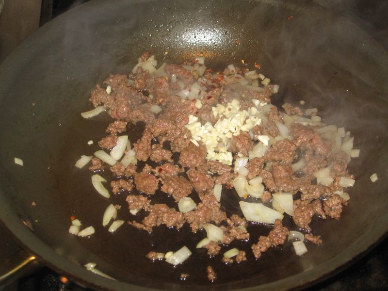Saute ground beef (you can substitute pork or veal, or include both) then add onions and garlic. I also added some crushed hot pepper (optional) and fennel seed.