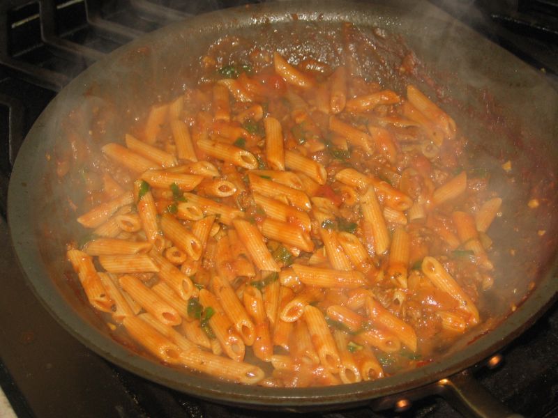 Meanwhile, I boiled the pasta al dente and added it to the sauce. I cooked the pasta in the sauce for a couple of minutes (to absorb its flavor), and then added a little Parmesan cheese.