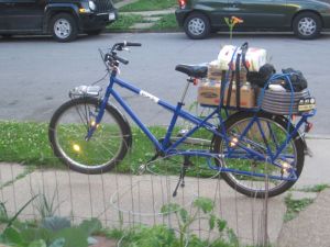 I always enjoy the comments and looks I get riding this bike, especially when it’s loaded…but I received one of the best comments today while riding down trendy Elmwood Avenue during peak rush hour. It was from a young woman riding a fixie going in the opposite direction. She was on the opposite side of the street and as she passed she sat up, took both hands off her handlebars in order to cup her mouth and yell: “Hey buddy, nice rack.” It made me smile.
