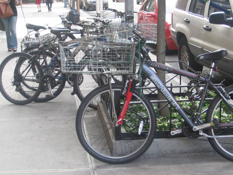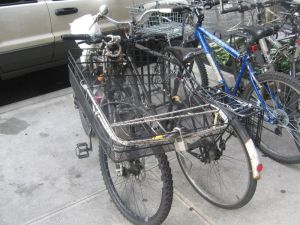 One of the things you’ll notice straight away about many of the bicycles in NYC is that many are cargo bikes, makeshift or not…delivering small loads (food, especially) by bike seems to make the most sense. Bikes fitted with racks and baskets are everywhere…many of the baskets are altered to make them able to carry larger loads.