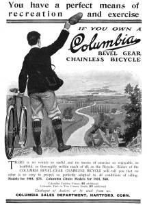 The Columbia Company’s website (the brand bike Annie rode) claims the are the oldest bicycle company in the United States…hmmm. Maybe, but like most companies that are old, they all seem to claim they are the first. The Pierce Arrow car company, which was based here in Buffalo, originally made bikes in the 1890’s. Anyhow, here’s a poster advertising a Columbia bike in 1901…just a few years after Annie began her journey. It’s interesting that the bike in the advert below is a chainless, so was another advertisement for a Pierce Arrow I came across from the same time…must have been the fad at the time. (Click it if you want to read the text of the ad.)