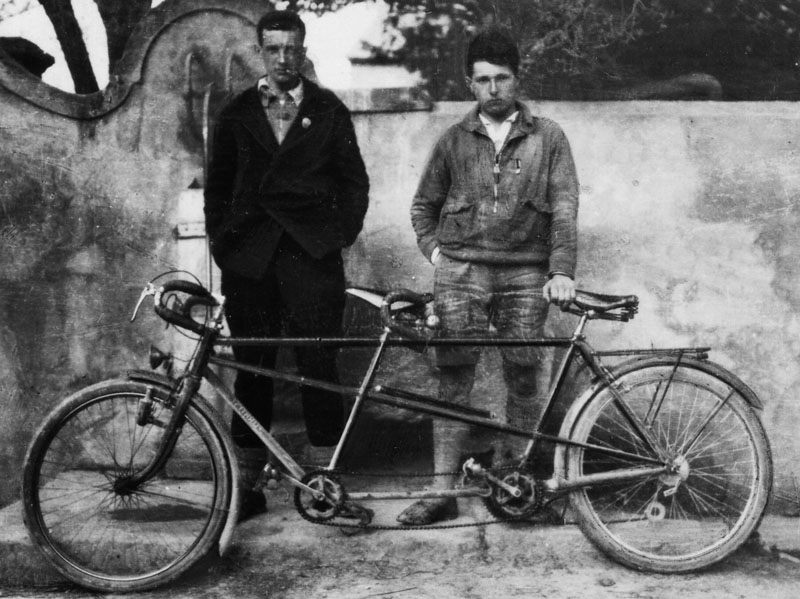 I love this photo and thought it appropriate to post it with the current Tour de France going on (is the race still going, or is it over yet?). It’s a photo of Georges Grillot and Roger Coiffier, tandem riders in the Brest–Menton race in 1930. It’s just one of the annual bike races in France. This is a race that cuts diagonally across the country. Brest is in the far north-west, and Menton is in the lower eastern portion of the country, bordering Italy. But look at those dudes…tough or what? They probably smoked and drank wine while they rode. If you look closely (click the image) you can see that the guy on the left (the one steering, presumably) actually has the stub of a cigarette in his mouth. And are those wool coats they’re wearing? What I also find interesting about the photo is that it looks like the bike has a derailleur…I didn’t know that these were in use in 1930 until I read this. I’m not sure if they won the race or not but they sure have the right attitude. If you want to read more about them click here (it’s in French).