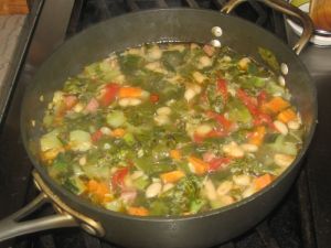 Well, despite the somewhat chilly summer (and untamed weeds) the garden is producing fairly well. The first photo is what I picked today in the front yard (tomatoes are still green, though). An is often the case I made a one-pot meal…with vegetables this fresh it would be more difficult not to make it delicious. I also added (not from my garden) onion, garlic, a small piece of kielbasa, a diced sweet potato, a couple sun-dried tomato, a can of cannellini beans, and a couple cans of chicken broth (in stead of water). This is a basic stew recipe (or ragu or ragout)…it can be made with almost anything you have at hand. It goes something like this: Sweat the onions and garlic along with any peppers, sausage (if you are including it…because this can easily be entirely vegetarian/vegan) and hard vegetables (such as carrots or potatoes) for 5 or 10 minutes, then add any soft and/or leafy vegetables; sweat them for another minute or so, then add broth or water along with any seasonings (I used basil and sage from the garden…normally I’d add dried pepper flakes but added some still-green cayenne peppers from the garden). Bring it to a boil, lower it to a simmer, and cook it until the vegetables are cooked and it’s flavorful. Depending on your mood, it can be served over rice (as I did tonight) or tossed with pasta. Variations of ingredients and flavorings are seemingly endless: Add a little ginger and soy for an Asian slant, curry for Near Eat, and cumin, allspice, and cinnamon for Middle Easter flavors…you get the picture. Leftovers taste even better the next day; if you make an extra-large batch (as I sometimes do) it freezes well (before mixed with rice or pasta).