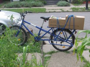 Two cardboard boxes containing a rented DVD, Chinese take out food, an Artvoice paper, a cable lock, and $62.00 in groceries.