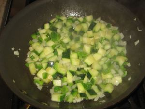 Dice everything up…I also included an onion and a couple cloves of garlic. Heat olive oil in a pan and saute everything except the tomatoes.
