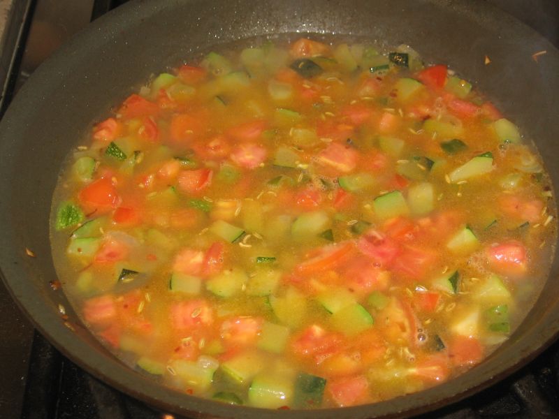 Just as things begin to brown add whatever seasonings you like…I added fennel seed and crushed hot peppers. Saute that for a minute then add the tomatoes. Normally this dish requires a little water or white wine form moisture to cook the vegetables…I chose to add chicken broth for flavor and to make the dish more substantial and nutritionally rich.