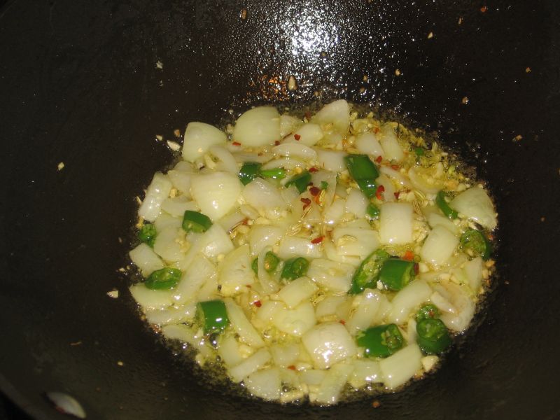 Heat a pan with olive oil over medium high heat. Add the onions and peppers first, when they begin to brown add the garlic (at this point I also add a little crushed hot pepper, fennel seed, and a pinch of sugar).