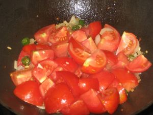 Core and quarter the tomatoes (no need to skin and seed them). Dice onions, garlic, and peppers (if you are using them).