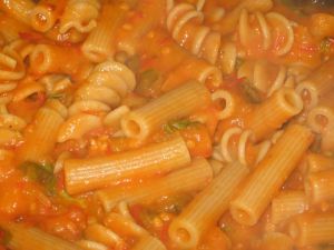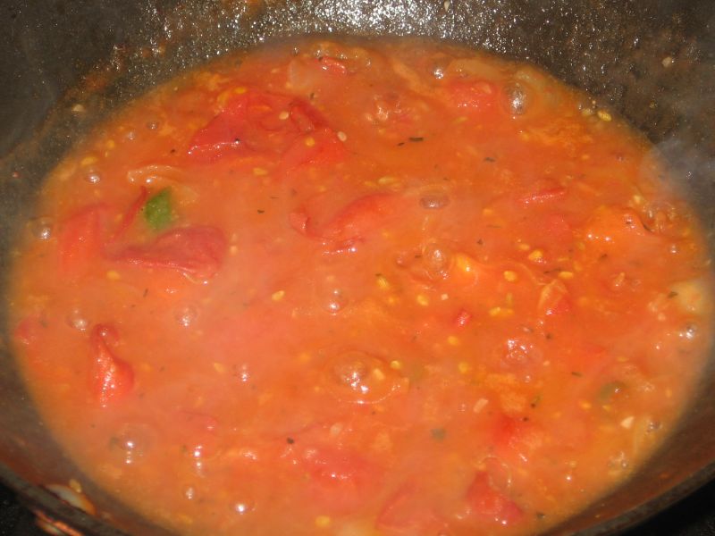 Stir the tomatoes with a little seas salt and the other ingredients and then add a cup or so of liquid…depending on what type of sauce your making this can be anything from water, chicken stock, or wine…I added a little wine and water. Bring the sauce to a simmer and cook the tomatoes about ten minutes (this would be a good time to cook pasta, if that’s what you’re making the sauce for).