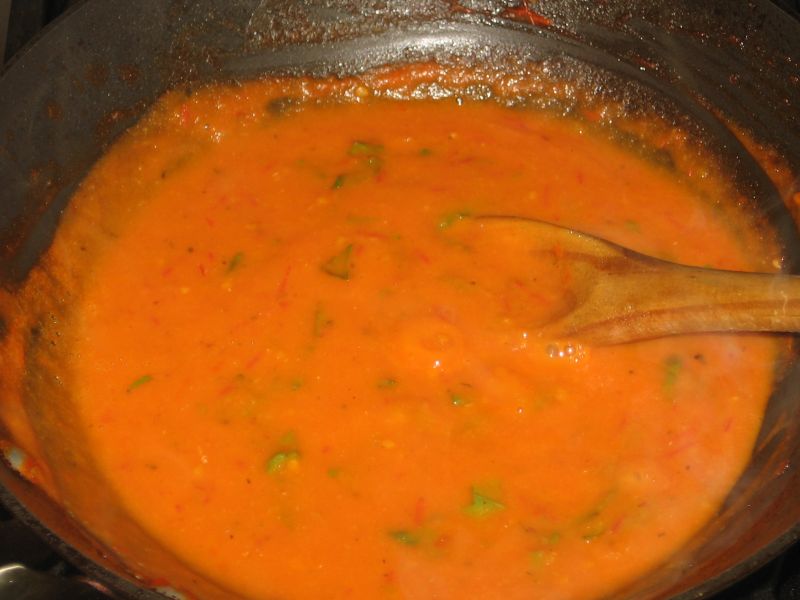 After the sauce is pureed, stir in fresh basil and simmer it for a couple minutes. Because the sauce is made with fresh tomatoes and then pureed, it takes on an almost creamy consistency.
