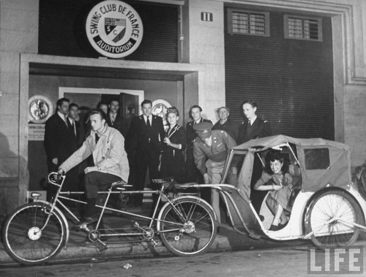 This photo was found here.A tandem pulling pulling a velo-taxi to a swing club…nice! Wish we had these taxis today. The driver looks like he thinks he’s pretty damn cool…wonder where the other bicyclist is.