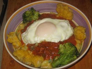 To assemble the dish(s) I first put a mound of polenta in a bowl and made an indentation in the center. I distributed the vegetables around the edge of the dish and filled the indentation in the polenta with a good helping of sauce. While the food was still steaming I quickly fried a couple eggs and laid it on each portion. It was good…really good, said my son…and it was soft enough to eat with his newly tightened braces.