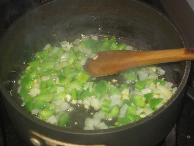 While the burger was simmering I started the polenta by sauteing some diced pepper, onion, and garlic in olive oil.