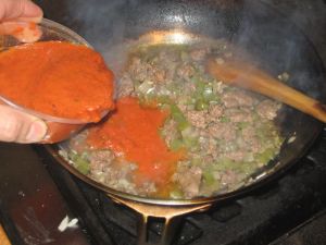Then I returned to the sauce (the water had evaporated and the ingredients were sauteing). I added the tomato sauce and brought it to a simmer.