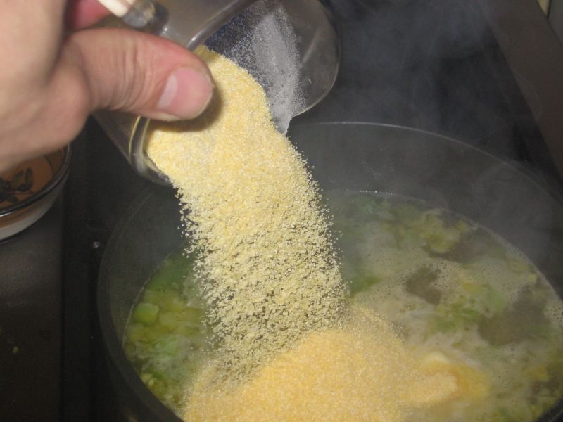 Next I added the cornmeal, and stirred it first with a wire whisk to remove any lumps, then with a wooden spoon for about five minutes to allow the cornmeal to cook and thicken.