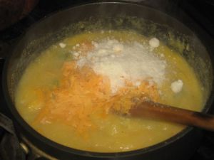 The combinations of ingredients that can be added to polenta are seemingly endless (herbs, cheeses, dried meats, vegetables, etc); I stirred in a handful of grated cheddar and Parmesan cheeses.
