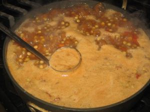 I brought the soup to a boil, skimmed it, and simmered it for about an hour…stirring, tasting, and replenishing liquid as necessary. It was delicious…I’m sure it will be even better for dinner tomorrow. The aromas this dish emits as it cooks (the combination of lamb, cumin, allspice, cinnamon, and garlic…probably) really brings me back to when I was a little kid at my sitte’s house.