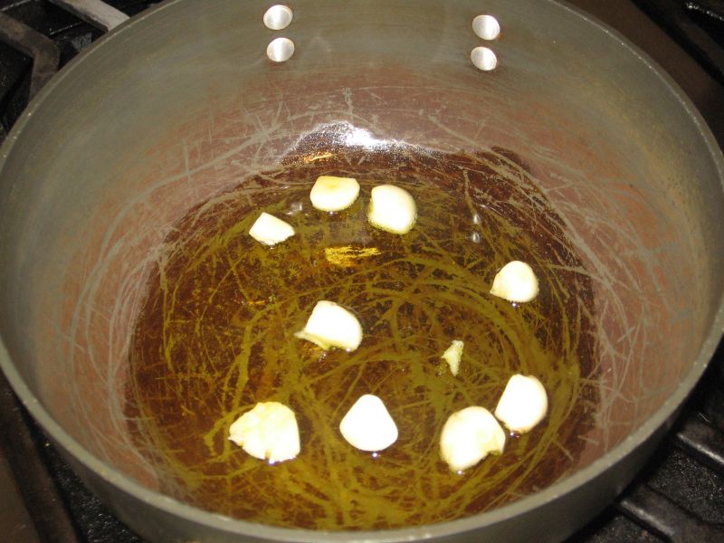 One of the keys to the recipe (I think) is poaching whole garlic cloves in olive. This is done slowly and the flavor permeates the oil. The garlic is removed, crushed, and added back to the recipe later. And the oil (which is permeated with garlic flavor) is used to saute the other ingredients and eventually becomes part of the recipe.