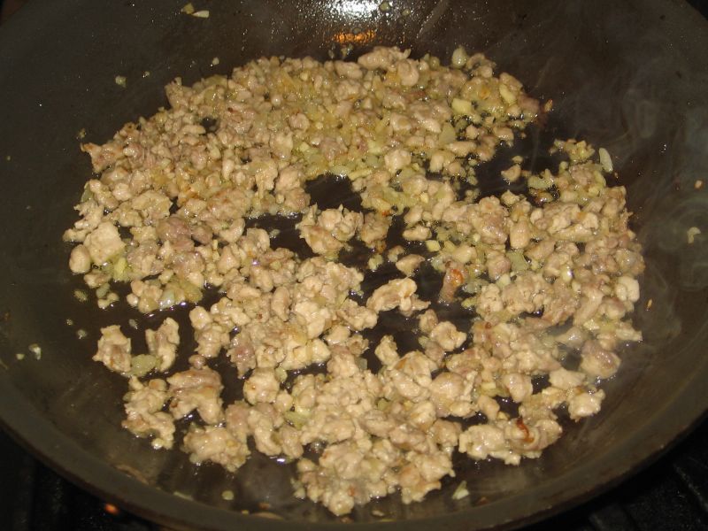 After heating a skillet with olive oil, I added the meat mixture and cooked it until it just began to brown.
