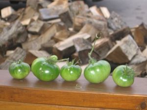 >I like this first photo…it really does (to me, anyway) represent two seasons colliding. The last of the tomatoes plucked from their vines…still green because of lack of warmth and just before pulling the plants from the dirt ’till next year…sitting on a sill in front of a newly delivered shipment of firewood for the coldness to come.