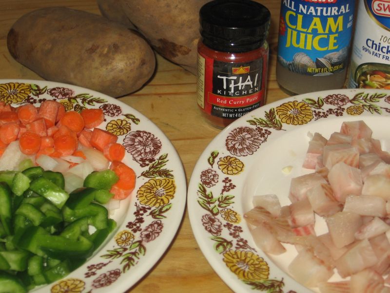 Add diced fish (I used tilapia) and clam juice or fish broth.