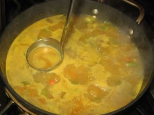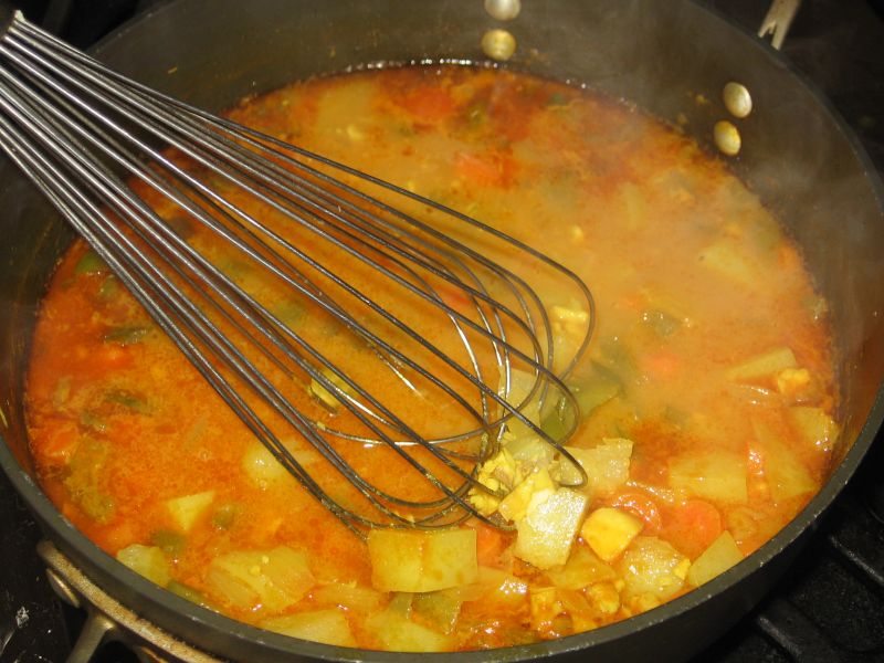 Using a wire whisk, mash the potatoes and fish (or puree the soup smooth if you’d like), then bring back to a simmer.