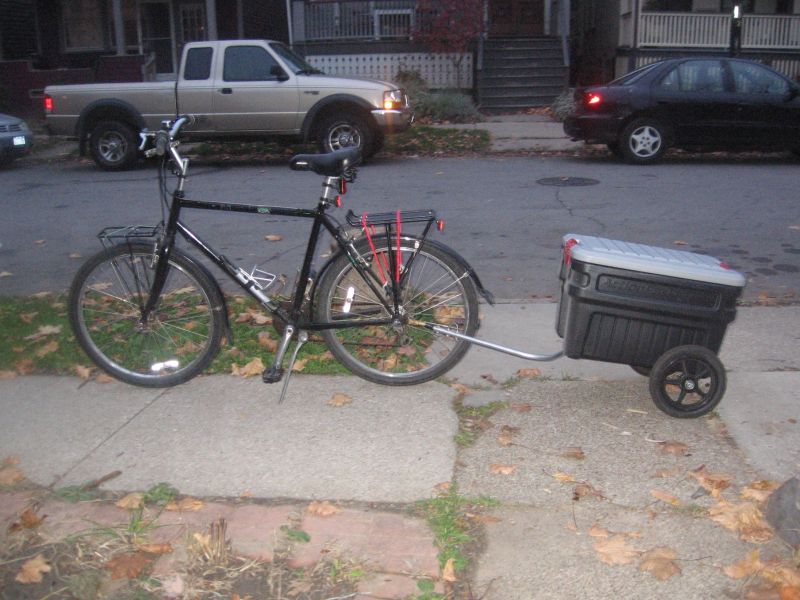 I took my old Trek (AKA, the mule) out for a spin today with my BikeRev trailer…getting ready for the snowy season. During the summer months (or should I say non-snowy months) I’ve been riding the Yuba and Dahon as my everyday bikes, but during the winter I use the mule a lot…and fitted with a covered trailer it keeps things from getting wet and snowy.
