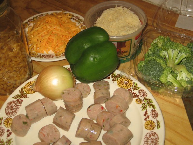 I made a fancy version of macaroni-and-cheese for dinner tonight…with four cheeses (smoked cheddar, asiago, Parmesan, and Romano), Italian sausage (made with chicken), sweet bell pepper, whole wheat pasta, and a few peas that I had in my freezer (the broccoli pictured was cooked separately).