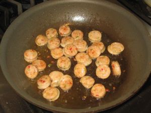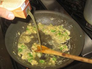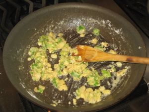 In the same skillet, add diced onion and pepper, then a clove of minced garlic. After the vegetables begin to brown add a few tablespoons of flour to make a roux.