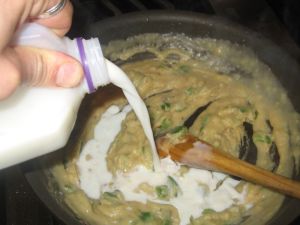 Cook the roux for a couple minutes (while stirring) then add chicken broth, heat and stir until thick, then add some milk and do the same.