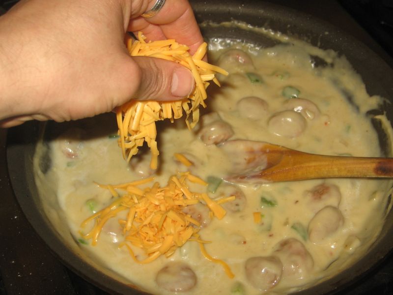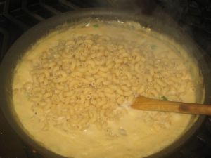 Add the sausage back to the pan and stir into the sauce, then add the four cheeses. While the sauce simmers (and the flavor of the sausage permeates it) cook the pasta al dente.