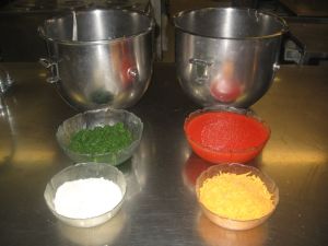 Here’s variation of a festive bread I often make around the holidays. It’s really just a basic butter-and-egg bread dough recipe with the addition of other flavoring/coloring ingredients. In this case I mad one dough with the addition of roast red pepper puree and cheddar cheese, and another dough with the addition of spinach pesto and extra Parmesan cheese. Then I rolled them together to make a sort of spiral…the outcome is always somewhat dramatic. One difference I used from a standard straight-dough method is to use an overnight pre-ferment (click here); this gives the bread far more flavor and texture. At any rate, as with most the recipes I post here, this is an easy one and can also be adapted to your personal taste…the interchanging of flavors and ingredients are seemingly limitless. When I rolled the dough together I switched the pattern (as to which dough was on the inside and which was on the outside) to keep it interesting. The flavor of these breads are so incredible you don’t even need butter (but that’s still good)…it makes excellent toast and whatever you put between two slices makes an awesome sandwich.