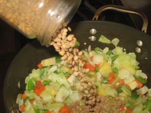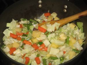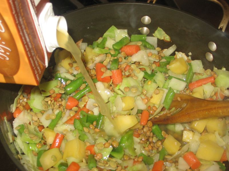 Here’s a list of other ingredients (not in any particular order): onion, carrot, green pepper, rutabaga, cabbage, potato, tomato (canned), lentils, green beans, chicken broth, and garlic (always lots of garlic!). Now here’s how I made it.
